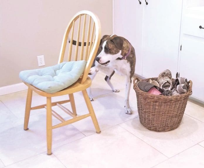 - Gradually hide the treat in harder places, having her “Scent!” before each set. “Harder” spots are on top of things, inside of other things (like a shoe, or on a shelf in a partially opened cupboard or closet), or inside open containers on raised surfaces.